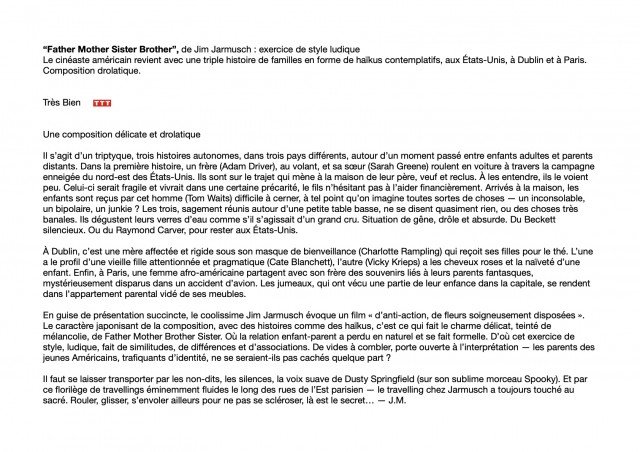 Critique Father mother sister brother ( télérama )